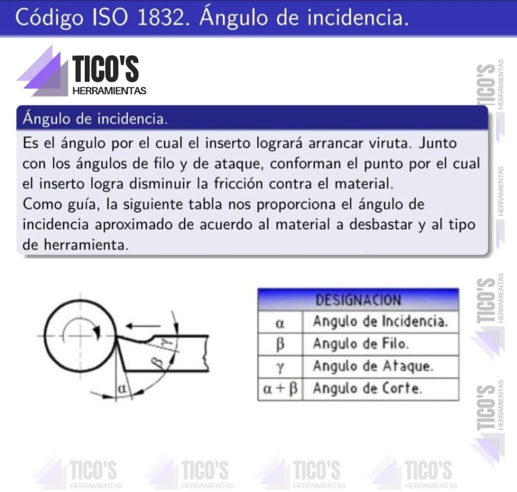 "Queremos mostrarles la norma ISO que reglamenta las características de los insertos, en este caso se trata de los ángulos que se recomiendan de acuerdo a los tipos de materiales, seguramente cada tornero tendrá su teoría de acuerdo a su experiencia, pero debemos decir que estos datos es bueno tenerlos en cuenta a la hora de realizar cualquier tipo de mecanizado "